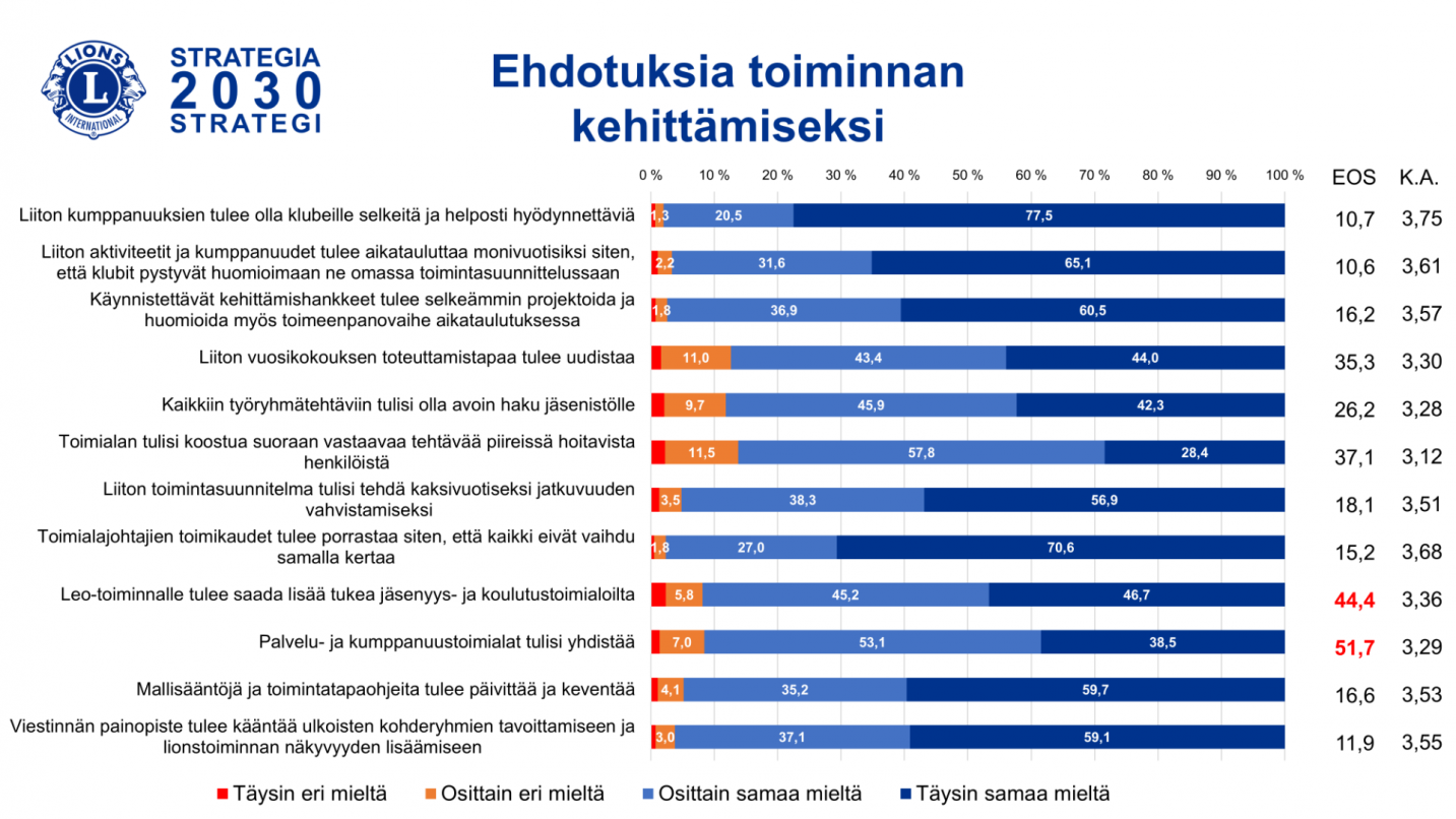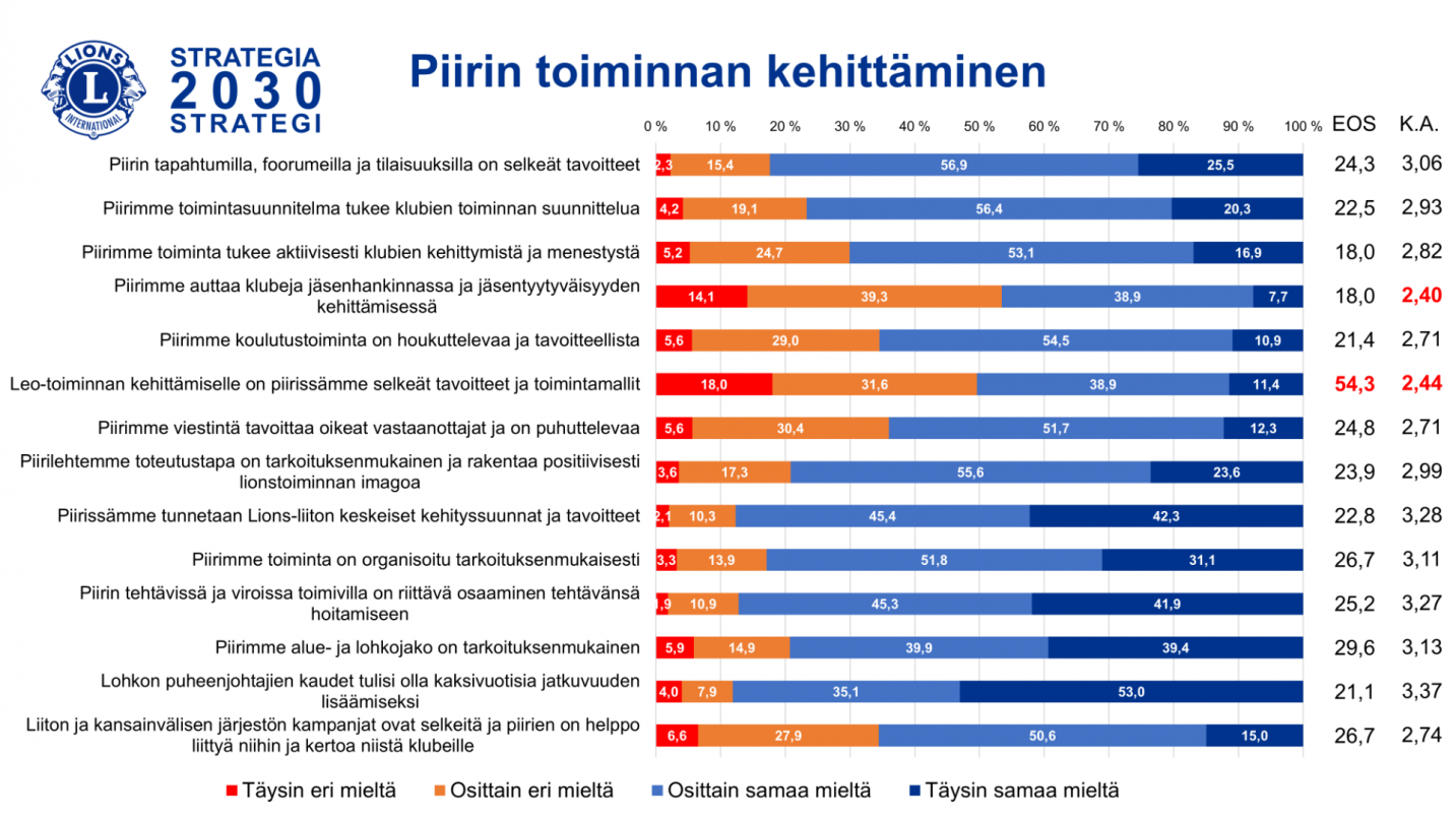 Eniten eri mieltä oltiin piirin tuesta klubien jäsenhankinnassa ja jäsentyytyväisyyden kehittämisessä sekä Leo-toiminnan kehittämisen tavoitteellisuudesta. Leotoiminnan kehittämiseen liittyvä kysymys sai yli puolelta vastaajista valinnan ”en osaa sanoa”, joten teema ei ole kovin tuttu monessakaan piirissä.