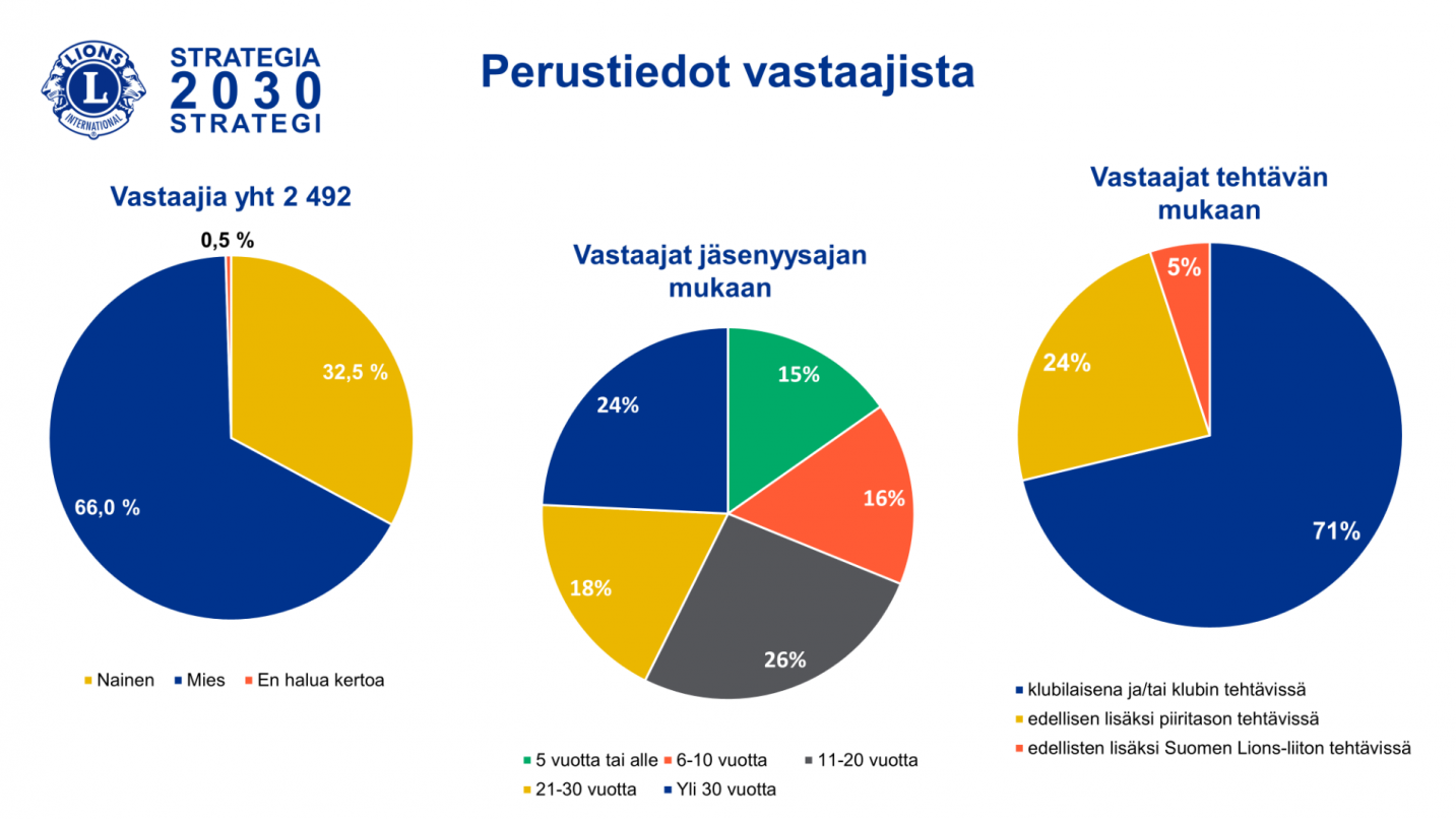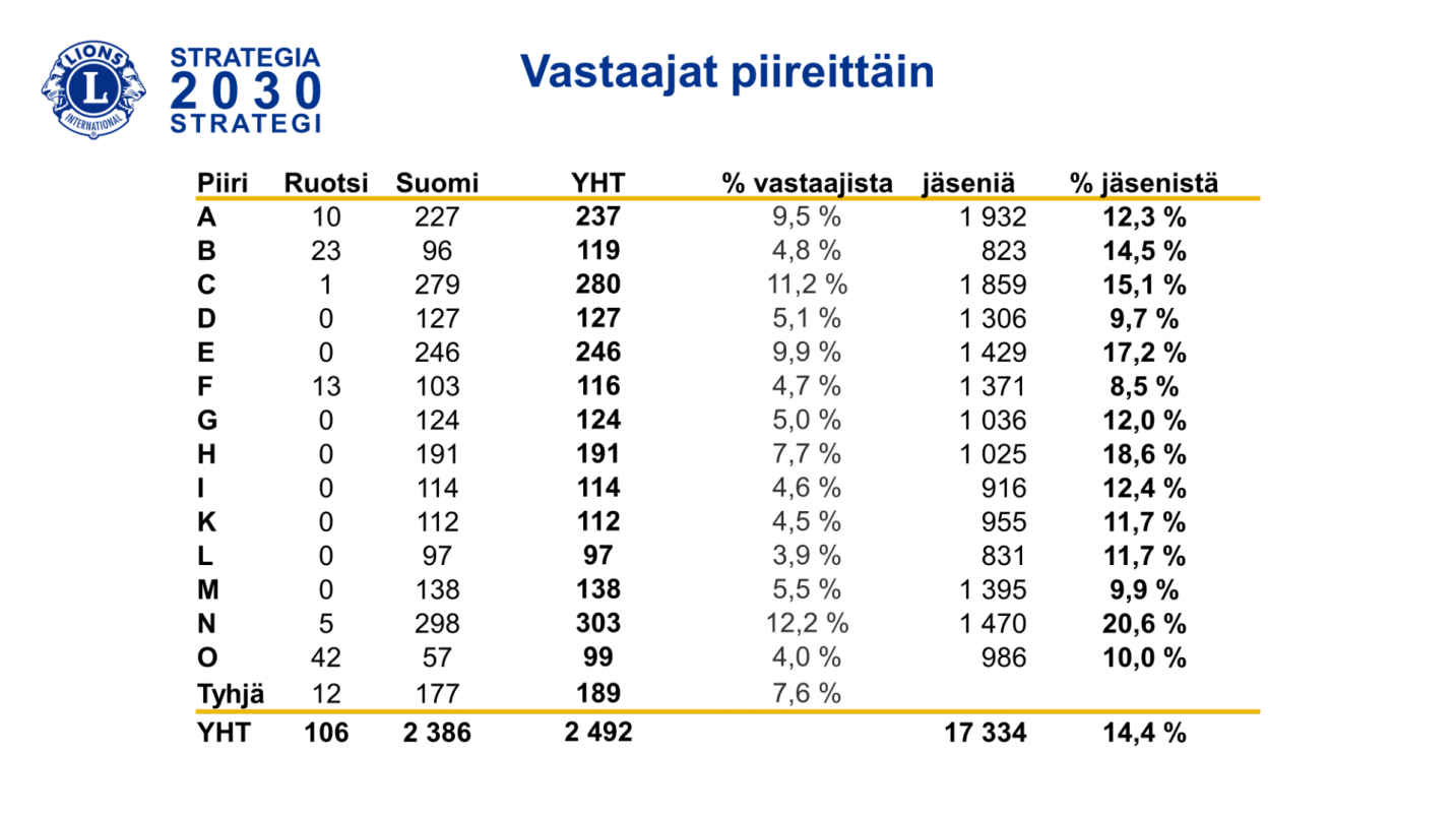 Vastausaktiivisuus vaihteli piireittäin ja suhteessa piirin jäsenmäärään paras vastausaktiivisuus oli N-piirissä. Kyselyyn vastanneista valtaosa on klubilaisena ja klubin tehtävissä toimineita. Piiritason tehtävissä toimineita vastasi 24 % ja liittotason tehtävissä toimineita 5 %. Vastaajat jakaantuivat suhteellisen tasaisesti jäsenyysajan mukaan alle 10 vuotta mukana olleiden painottuessa hienokseltaan.