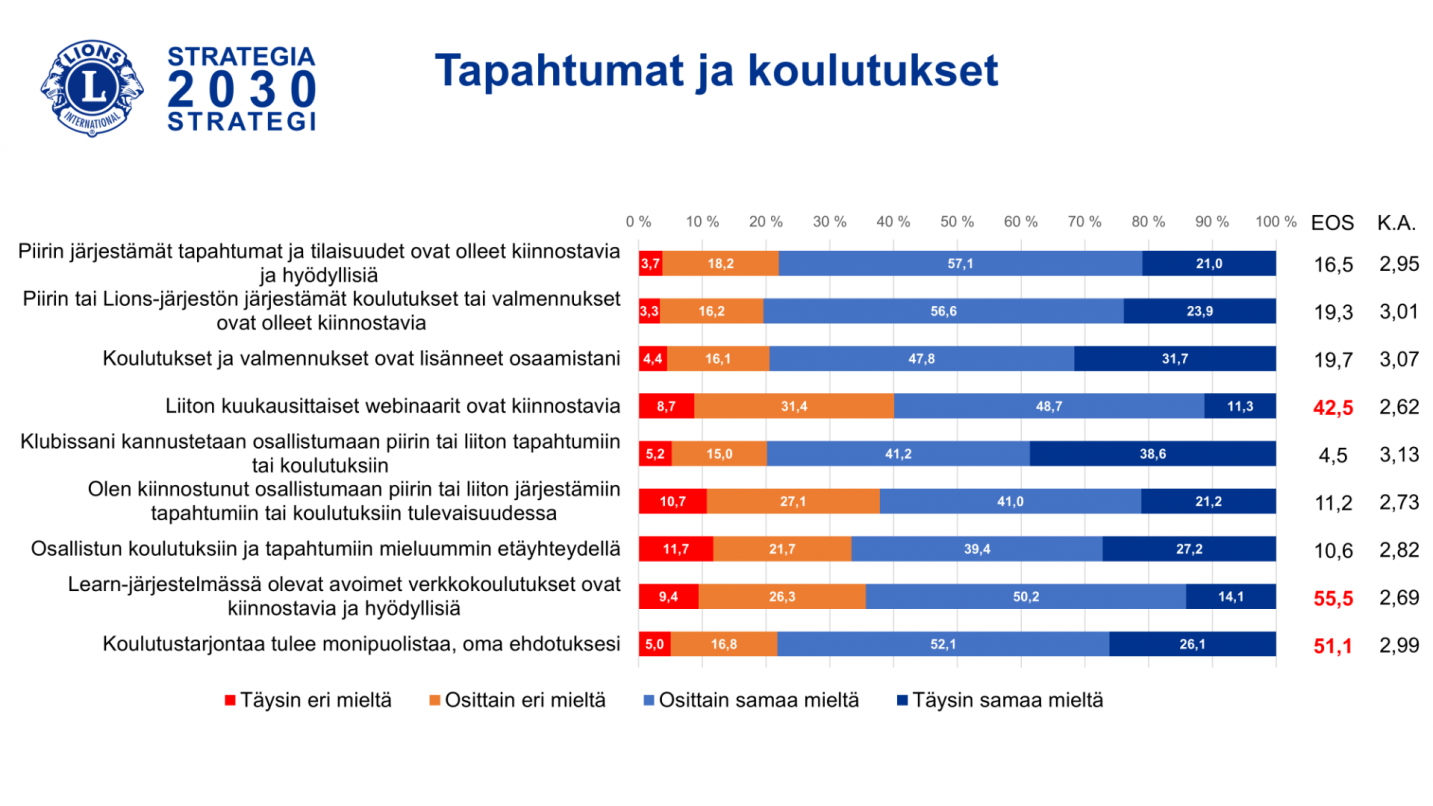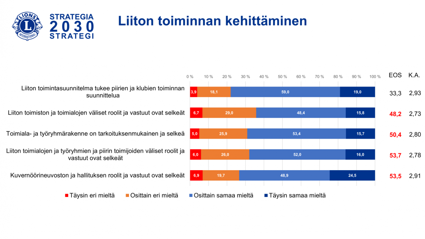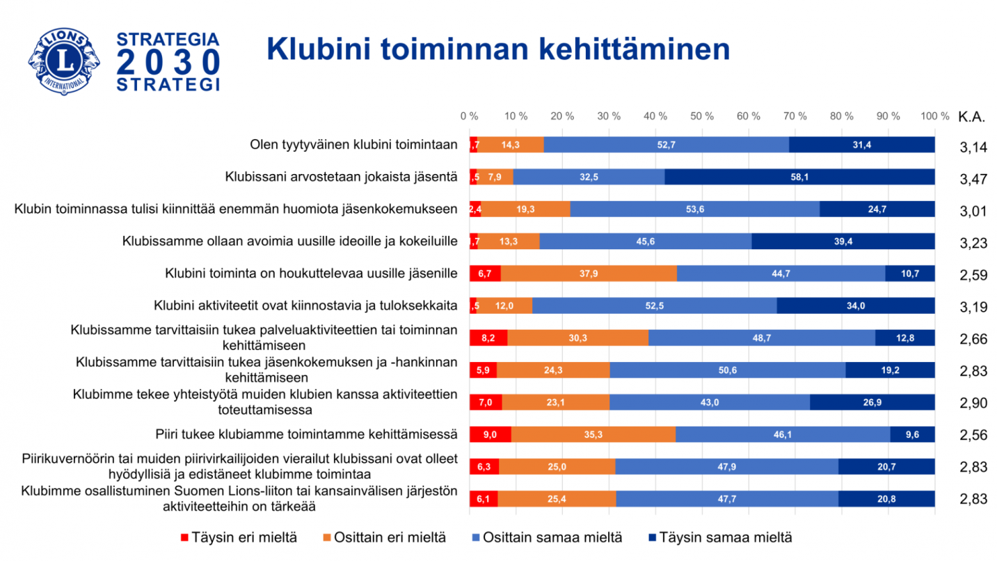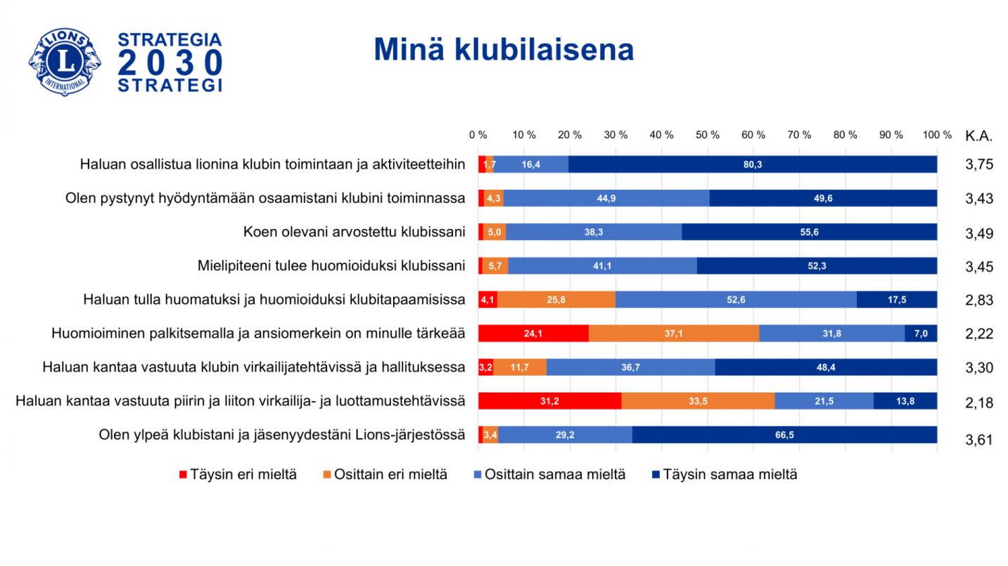 Vastauksissa korostui ilahduttavasti halu osallistua toimintaan ja aktiviteetteihin sekä ylpeys klubista ja jäsenyydestä Lions-järjestössä. Kokemus arvostetuksi tulemista klubissa, mielipiteen huomioiduksi tulemisesta ja oman osaamisen hyödyntämisestä klubin toiminnassa oli erittäin hyvällä tasolla.