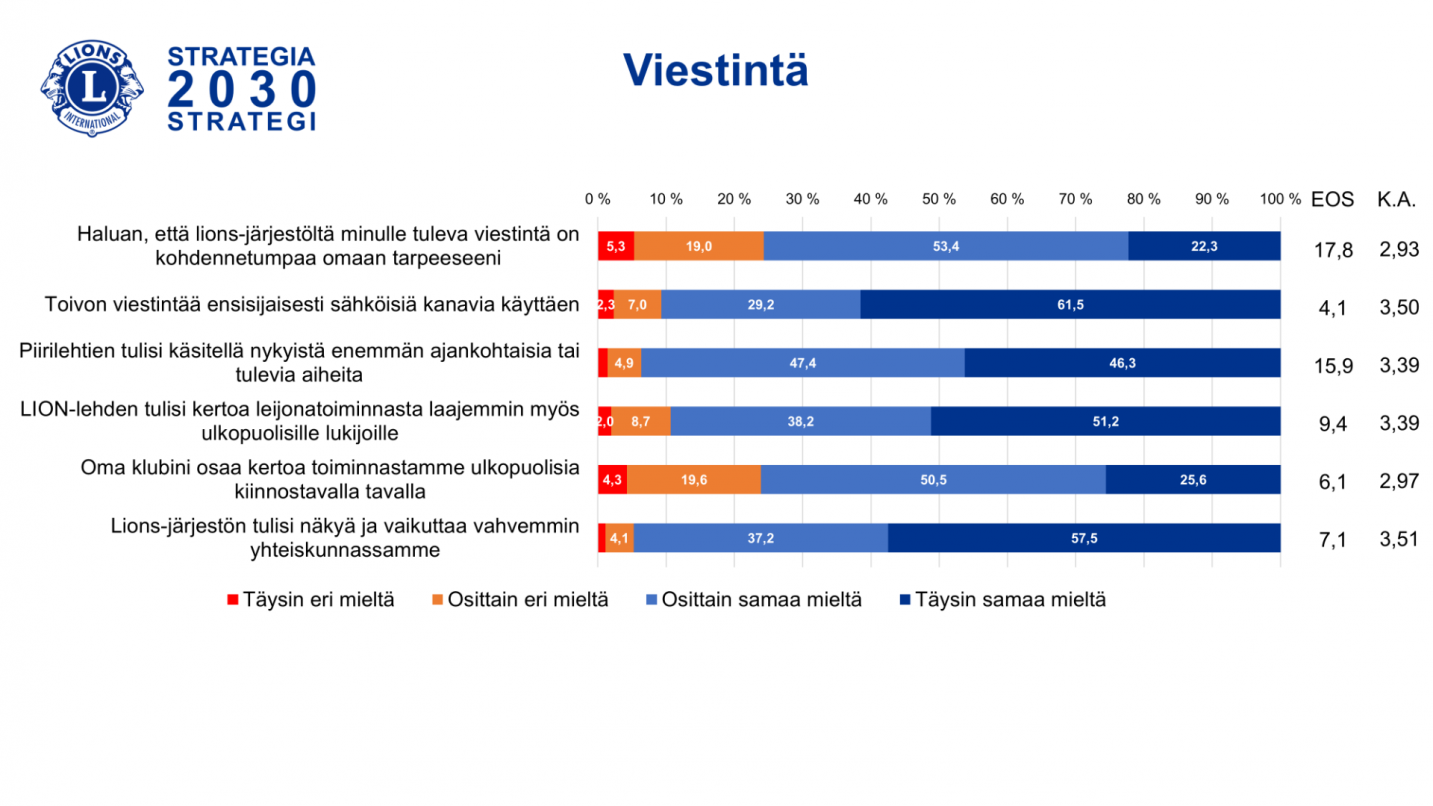 Valtaosa vastaajista oli osittain tai täysin samaa mieltä viestintään liittyvistä väitteistä. Kohdennetumpi viestintä, sähköisten kanavien hyödyntäminen, piirilehtien ajankohtaisuus, LION-lehden kohdentaminen ulkopuolisille sekä Lions-järjestön vahvempi näkyminen ja vaikuttaminen yhteiskunnassa koettiin tärkeiksi.