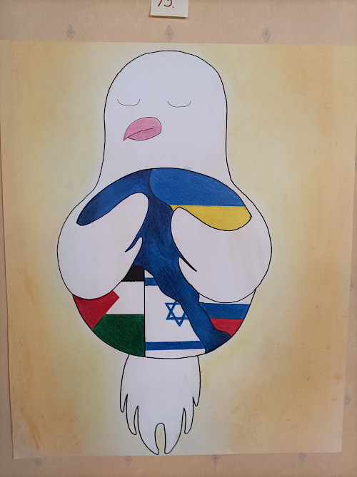 Kolmanneksi tuli yleisöäänestyksen voittanut M-piirin työ, jonka on tehnyt 12-vuotias ulvilalainen Iina Multanen Friitalan koulun 6AB-luokalta. Työn nimi on "Rauha koostuu monista asioista". Facebook-äänestäjän kommentin mukaan "Selkeä, yksinkertainen ja kaiken kertova työ, jossa kauniisti tuotu asia esille".